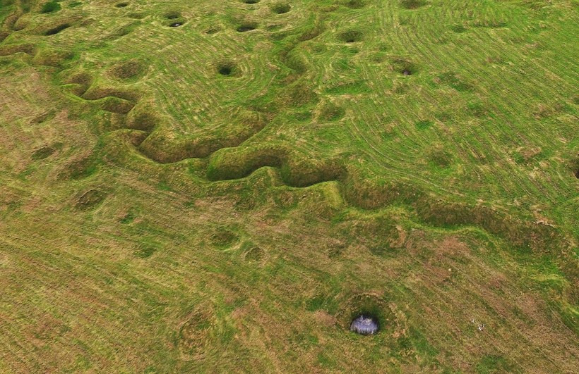 При съемке с высоты отчетливо заметны оставшиеся со времен войны траншеи и оборонительные сооружения.