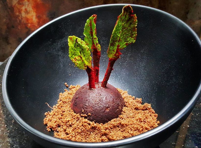 Шоколадно-свекольный брауни с наполнителем из шоколадного мусса, шоколадной «землей» и листьями мяты.