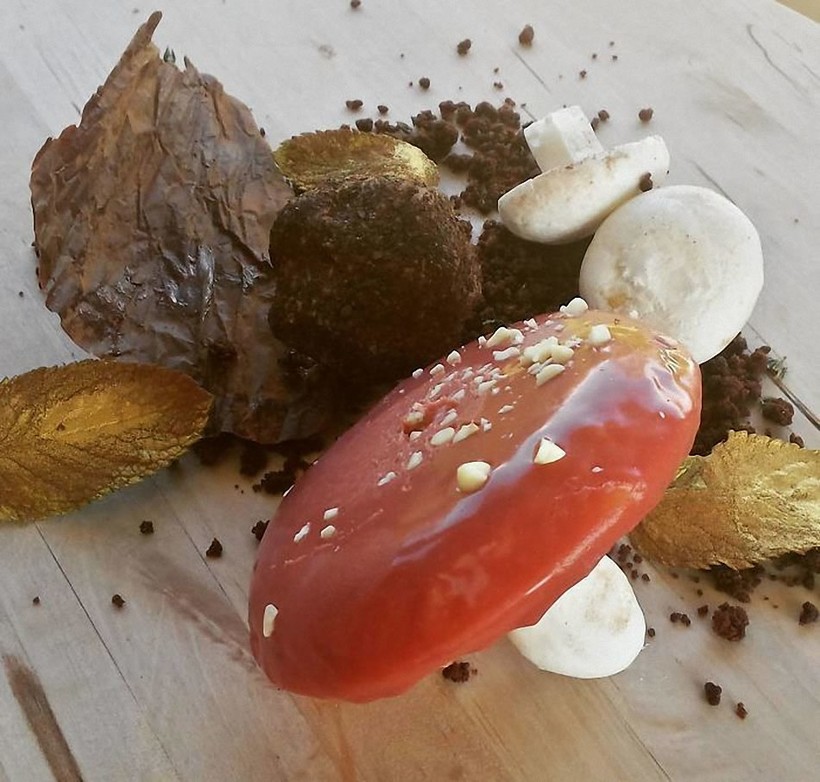 Вишневый бисквит, кокосовый трюфель, лимонные безе-грибы, шоколадно-коричная кора.