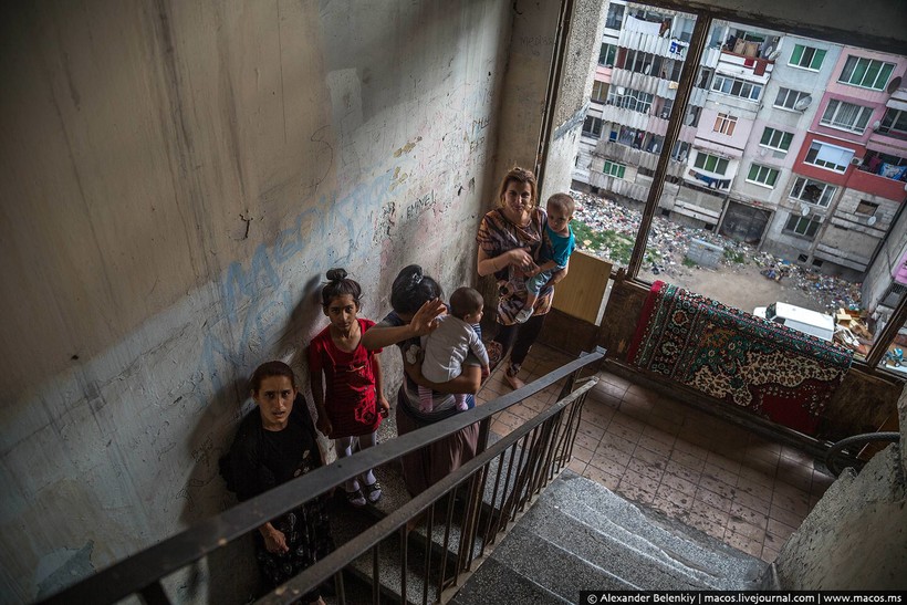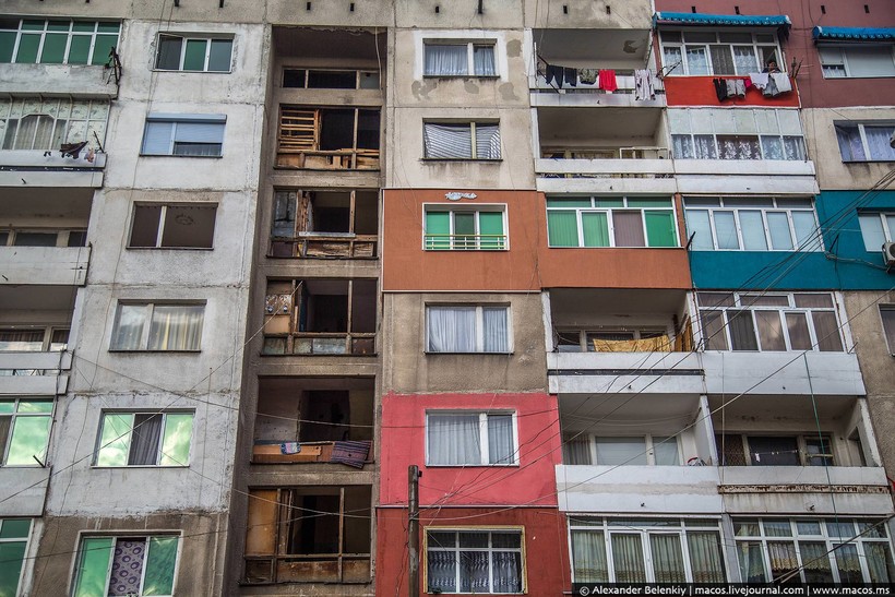22. Типичная цыганская многоэтажка. Квартиры бедняков с занавесочками без стекол, и жилища тех, кому не плевать на самого себя — аккуратные окна и даже покрашенные снаружи стены. Но общие пространства, вроде лестничной клетки сожжены, окна выломаны. Такое отношение: общее значит ничье.