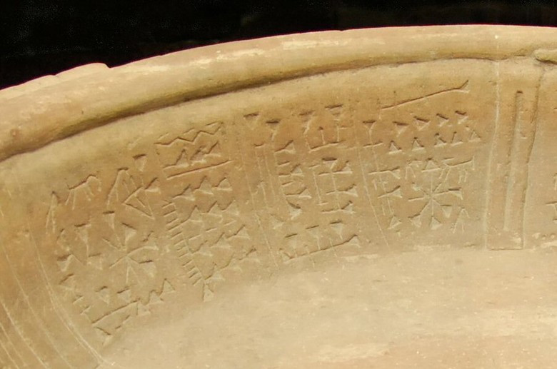 Керамическая чаша внутри и снаружи покрыта различными рисунками и текстом на двух языках, напоминающих клинопись. Исследователь попытался прочесть надписи, но ничего не смог понять, а когда находка попала в руки муниципальных властей, ее сочли подделкой и отправили на склад.