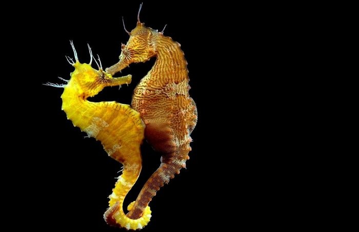 Отношениям морских коньков вообще можно позавидовать. Обычно они выбирают себе пару на всю жизнь, пусть и короткую (обычно коньки живут до пяти лет). Они флиртуют друг с другом, цепляются хвостиками, а еще именно папы вынашивают потомство.