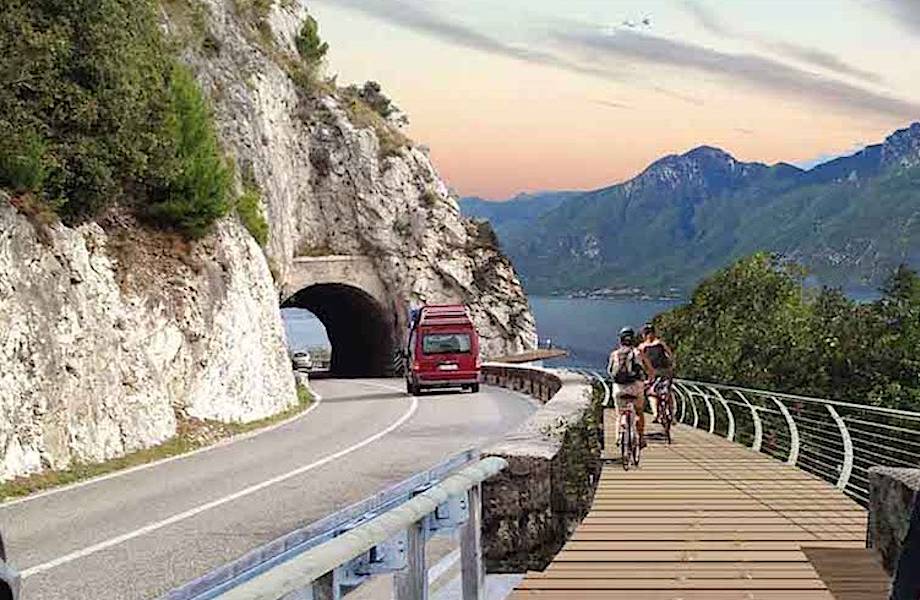 В Италии идет строительство самой красивой дороги для велосипедистов. Велотрасса пройдет вдоль побережья озера Гарда и по долине Трентино. Дорогу строят непосредственно в скалах, и она нависает над озером. Веломаршрут получил название Garda by Bike, и его уже называют самым красивым местом для велопрогулок в мире.