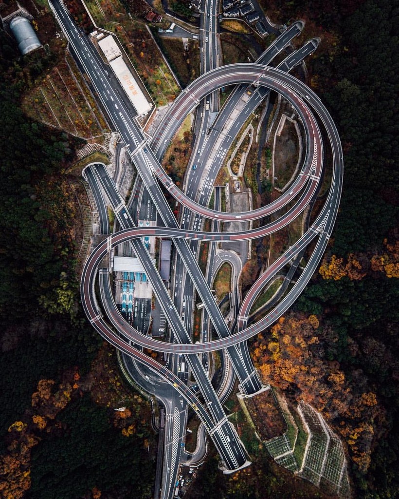 Вот, например, невероятная развязка недалеко от города Сагамихара с населением в 722 тысячи человек. Она находится в горах и соединяет не только трассу, но и горные туннели.