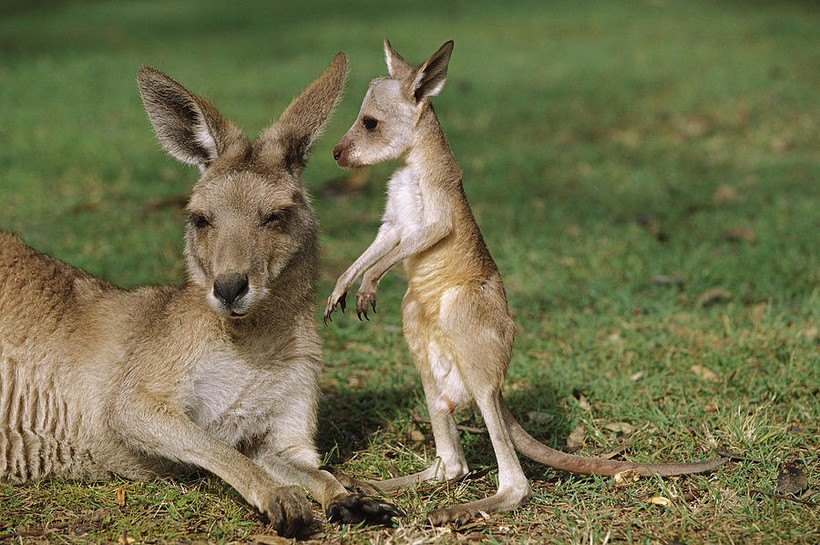 Долгое время ученые вообще думали, что кенгурята появляются прямо в сумке из соска матери (а некоторые австралийцы и сегодня так думают), однако нет, рождаются они так же, как и другие млекопитающие. Уникальность этого процесса заключается еще в том, что кенгуру — единственные на планете млекопитающие, у кого такие крохотные детеныши по сравнению со взрослой особью.