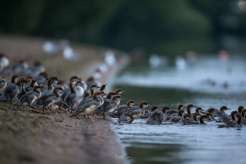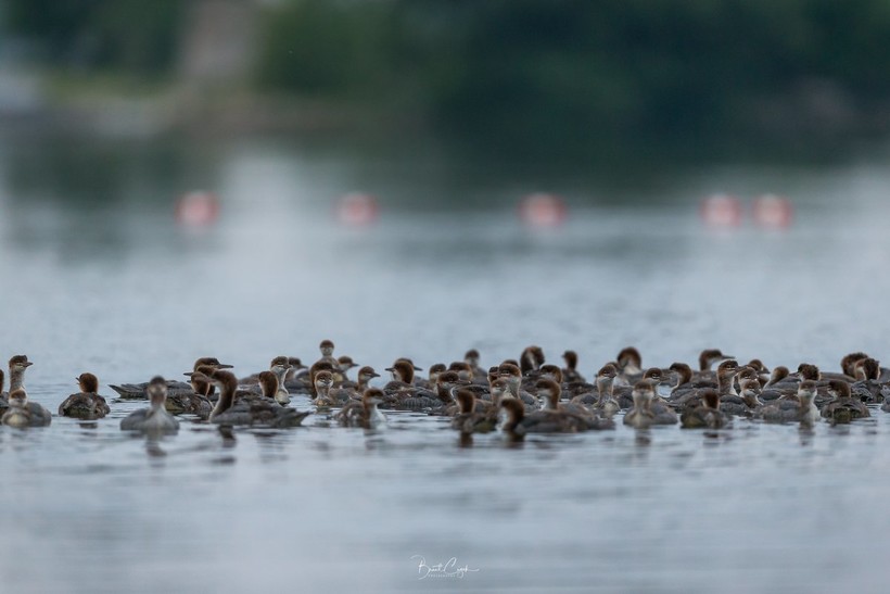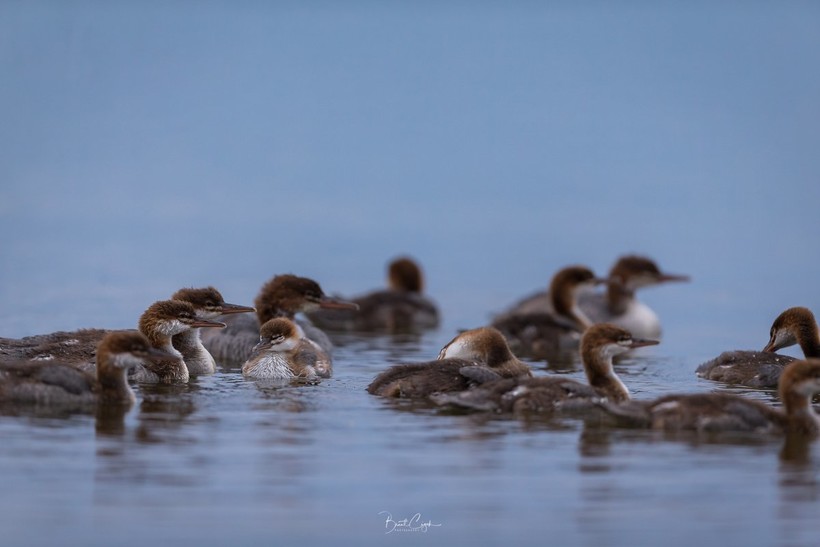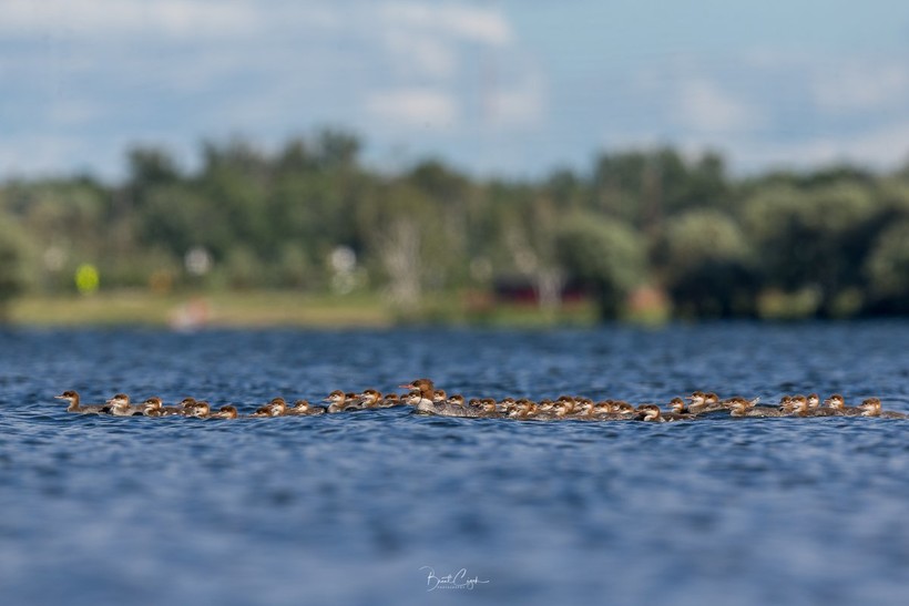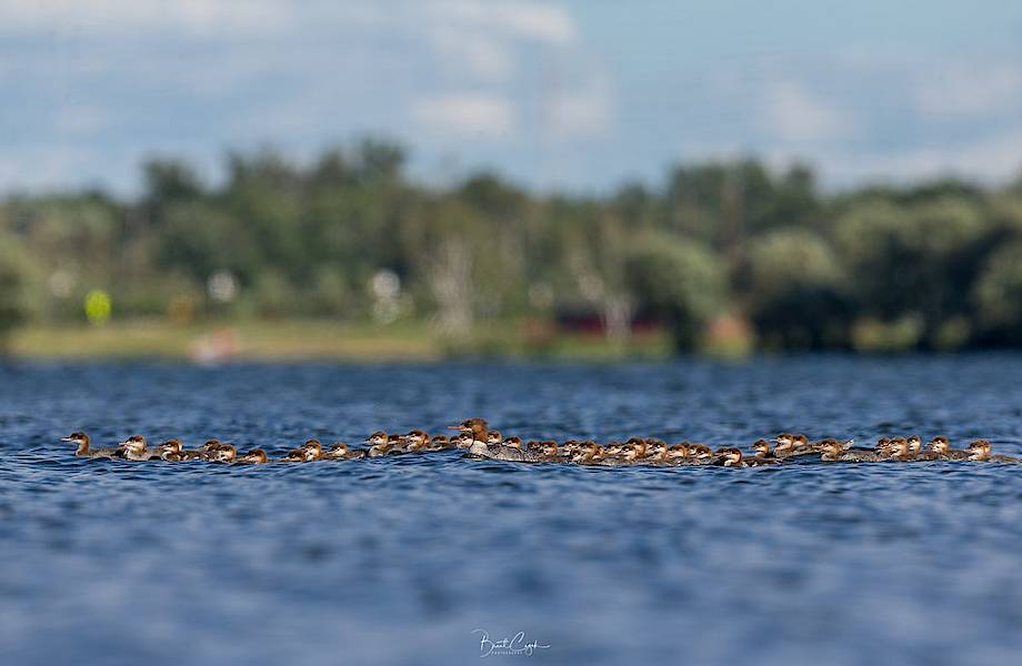 Фотограф Брент Сайзек плавал на лодке по озеру Бемиджи в штате Миннесота, когда стал свидетелем удивительной картины: мама-утка а за ней просто огромный выводок утят. Так как Брент не планировал много фотографировать, у него была с собой лишь камера с одним объективом. Он постарался снять необычное семейство, тогда ему показалось, что утят около пятидесяти.