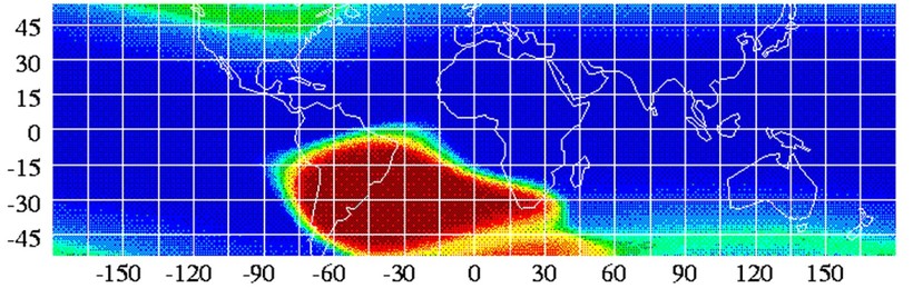 Регион, расположенный в Южном полушарии, получил название Бразильской, или Южно-Атлантической магнитной аномалии. Место, где в магнитном поле Земли наблюдаются существенные отклонения от нормы, охватывает большую часть Южной Америки и южную часть Атлантического океана. Магнитное поле защищает нашу планету от постоянного потока солнечного ветра, но только не в этом странном месте, где она практически беззащитна перед потоком радиоактивных частиц. В этом месте наблюдается провал магнитного поля, который означает, что верхняя граница защитного слоя находится не на высоте 1200-1300 километров, а всего на высоте 200-300 километров.