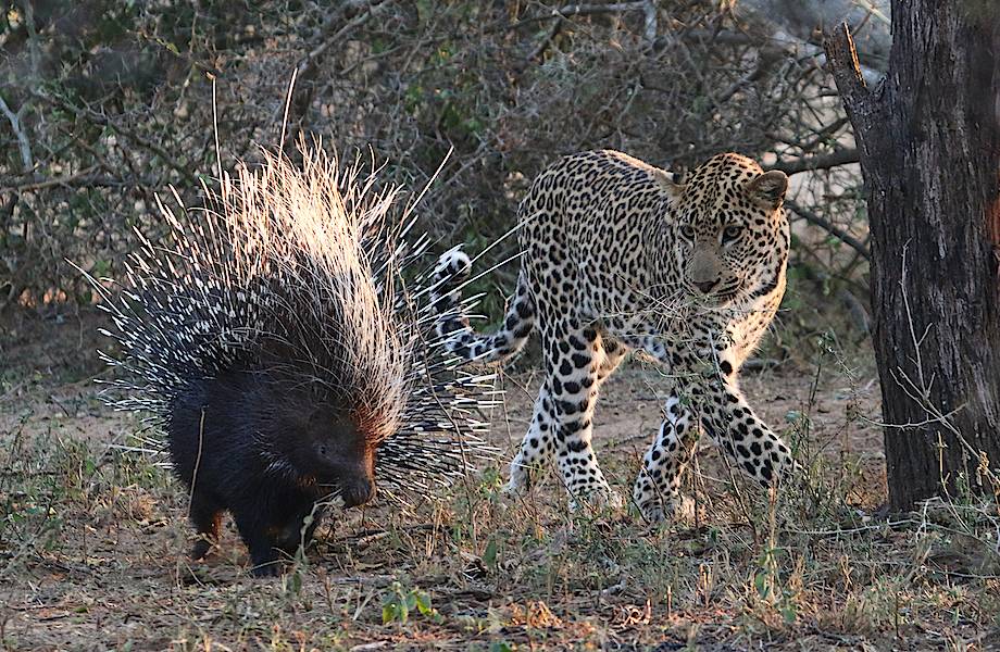 Повстречав на своем пути довольно упитанного грызуна, голодный леопард уже наверняка предвкушал вкусный обед. Да только получилось, что блюдо не так-то просто съесть, поскольку оказался им колючий дикобраз. Продолжительное время несчастный хищник ходил за зверьком по пятам, пытаясь разгадать хитрый способ поедания дикобраза: с какой только стороны ни пытался он подобраться, но жесткая щетина лишь больно колола лапы. Словно насмехаясь над дикой кошкой, грызун, кажется, даже не замечает, что на него охотятся. В конце концов упорный леопард настолько устал от бесполезной борьбы, что просто грустно лег на дорогу, а колючий дикобраз издевательски расположился неподалеку.
