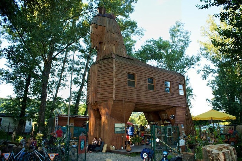 На берегу Влтавы в районе Трои расположен очень необычный бар под открытым небом. Найти его легко — вы еще издалека увидите огромного 10-метрового деревянного коня. Примечательно это место тем, что это не просто бар, но также театр, галерея, кинотеатр и открытая площадка для творчества.