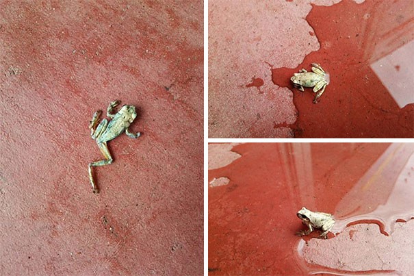 Персонал магазина нашел полностью высохшую и не подававшую признаков жизни лягушку утром на полу. Они решили плеснуть на нее немного воды и животное ожило!