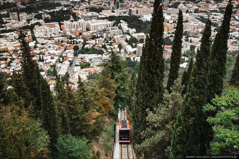 Продолжим изучать небанальный общественный транспорт Тбилиси и теперь прокатимся на фуникулере. Он идет на гору Мтацминда, а стоимость его составляет все те же 2,5 лари в одну сторону. Плюс 2 лари за невозвратную карту, на которую вам запишут поездки. С Мтацминды вновь любуемся городом, а спуститься вниз лучше по лестнице, времени это много не займет.