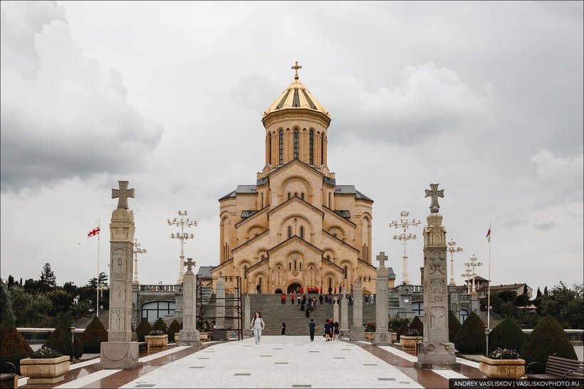 Перемещаемся в противоположную часть старого города — к собору Цминда Самеба. Осматриваем самый крупный собор города и после этого вкусно едим в кафешке знаменитой сети «Воды Лагидзе», которая находится прямо на территории собора. Еда тут очень простая, а вот шоколадный и сливочный лимонад попробовать нужно обязательно!