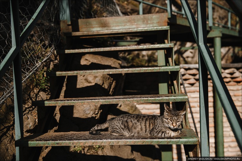Итак, вы в Тбилиси! Чемоданы побросаны в гостиничном номере, телефоны заряжены, надета удобная обувь — лет'с гоу, в общем. Куда ехать? Ну, конечно же, в центр! А конкретно — в район Сололаки. Самое банальное, что сейчас можно сделать — это подняться к крепости Нарикала. У вас два пути: либо канатная дорога за 2,5 лари (чуть больше 60 рублей), либо пешком по лестнице, которая отходит от улицы Асатиани. И сейчас мы выбираем именно пеший вариант. Тут шикарные виды на старый город и много котиков!