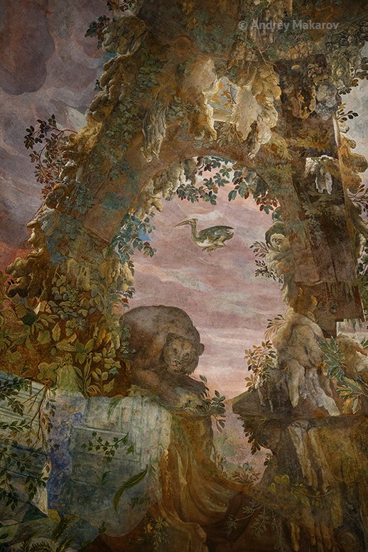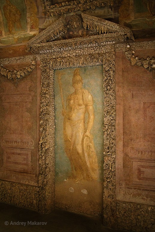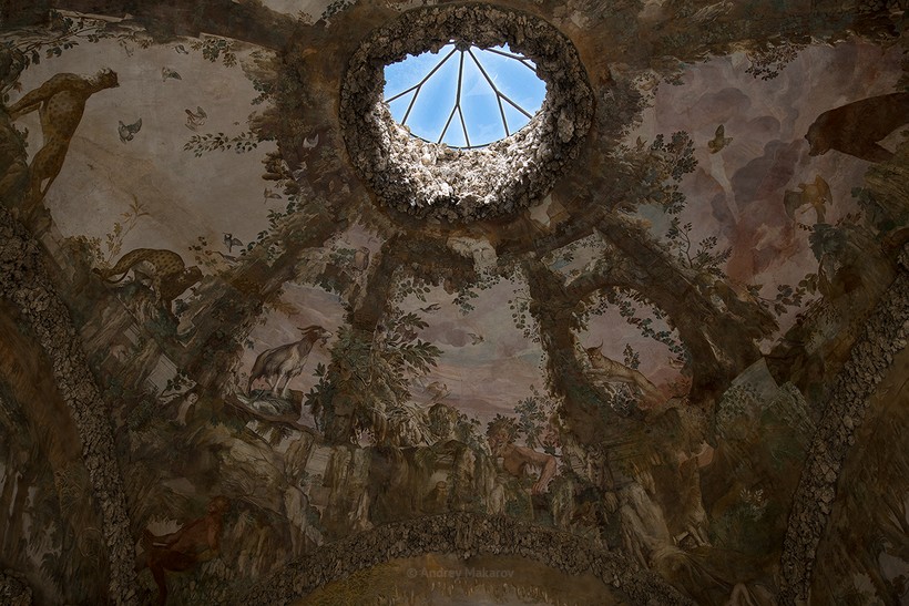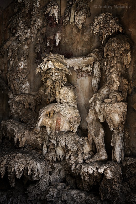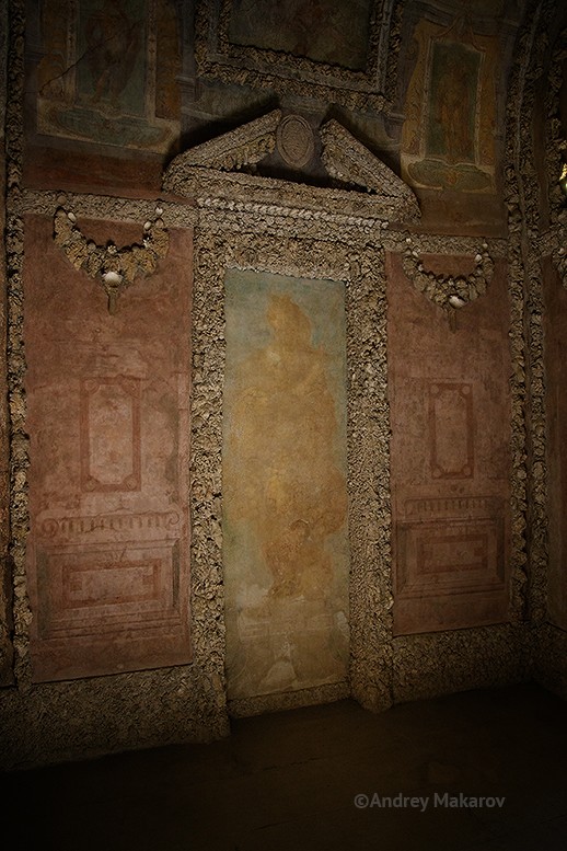 Эстетические впечатления были не менее сильны. Сначала я подумал, что грот — деяние современное, эпохи модерна, настолько необычное в нем оформление. Натуроморфные мотивы, искусственные сталактиты, сталагмиты, странные, словно огарки свечей, скульптуры, раковины и кораллы в оформлении — всё это напоминало искусство модерна, но при ближайшем рассмотрении оказалось куда более тонким и изящным. При совсем близком ознакомлении элементы скульптур могут производить даже отталкивающее впечатление, настолько они хаотичны и необычны, поэтому рассматривать их надо на максимальном удалении и слегка расфокусированным взглядом.