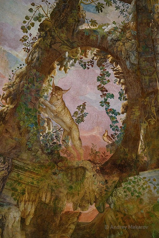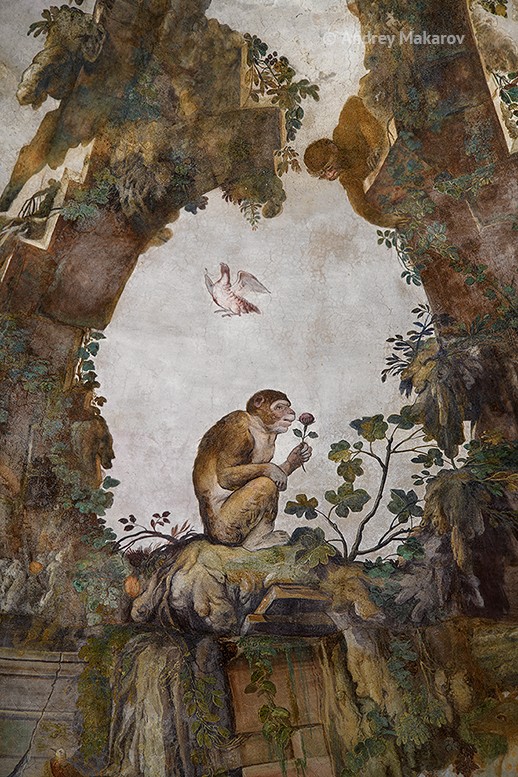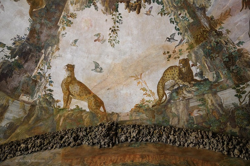 Второй зал похож на первый. В третьем, помимо фресок, росписей и ниш, есть еще мраморный фонтан, на котором установлена Венера работы Джамболоньи, а на потолке изображено небо с птицами.