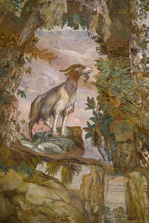 Грот разделен на три части. Первая — самая большая: стены украшены, помимо упомянутых сталактитов, настенными росписями с изображением коз, овец, обезьян и гепардов, обитающих в удивительном и даже фантастическом саду в нежно-розовых тонах. Грот расписан художником Поччетти.