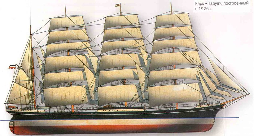 Четырехмачтовый барк, а именно так звучит название этой категории судов, был спущен на воду в далеком 1926 году. Парусник построили в Германии, на верфи в Гестемюнде, и он получил имя «Падуя». Это был последний барк из серии «Летучий П-Лайнер» (Flying-P-Liner) и последний крупный парусник, построенный без вспомогательного двигателя. Все предыдущие парусники из этой серии, а их насчитывалось 15, также имели названия, начинающиеся на букву «П» и являлись крупными грузовыми парусниками, способными совершать дальние плавания через океаны и перевозить большие объемы грузов.