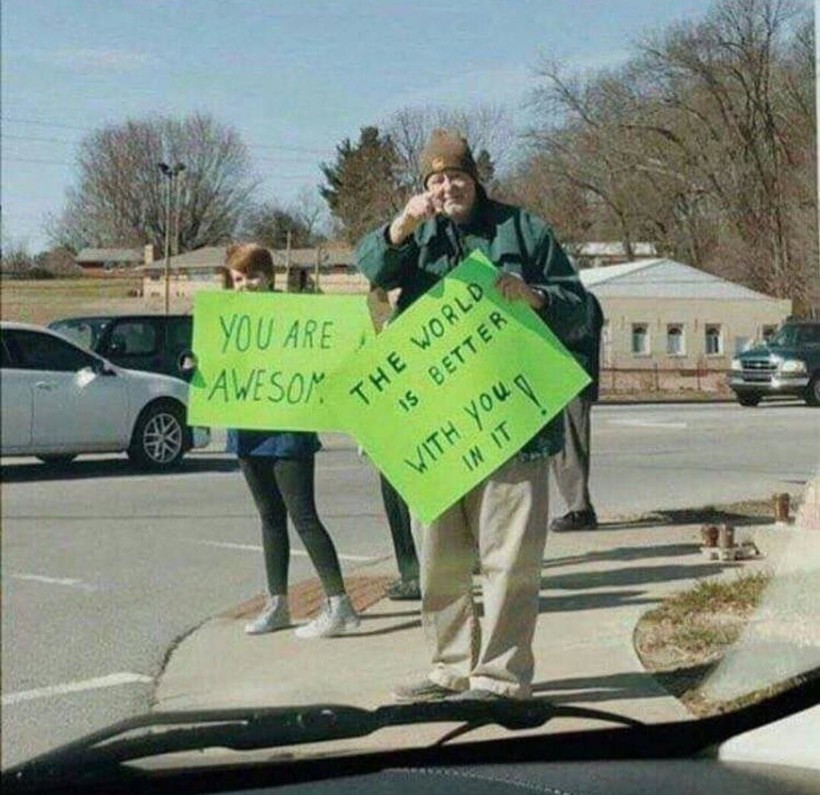 Канадцы настолько добрые и милые, что периодически они выходят на улицу с воодушевляющими плакатами, способными подбодрить кого угодно (Надпись на плакатах: «Ты прекрасен», «С тобой мир лучше»).