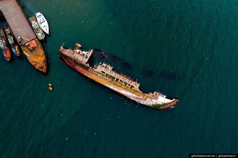 Затонувшее судно «Нева». Эта ремонтная плавучая база потерпела крушение в акватории рыбного порта еще в 1999 году, но ее до сих пор не могут поднять и утилизировать, несмотря на соответствующее решение суда.