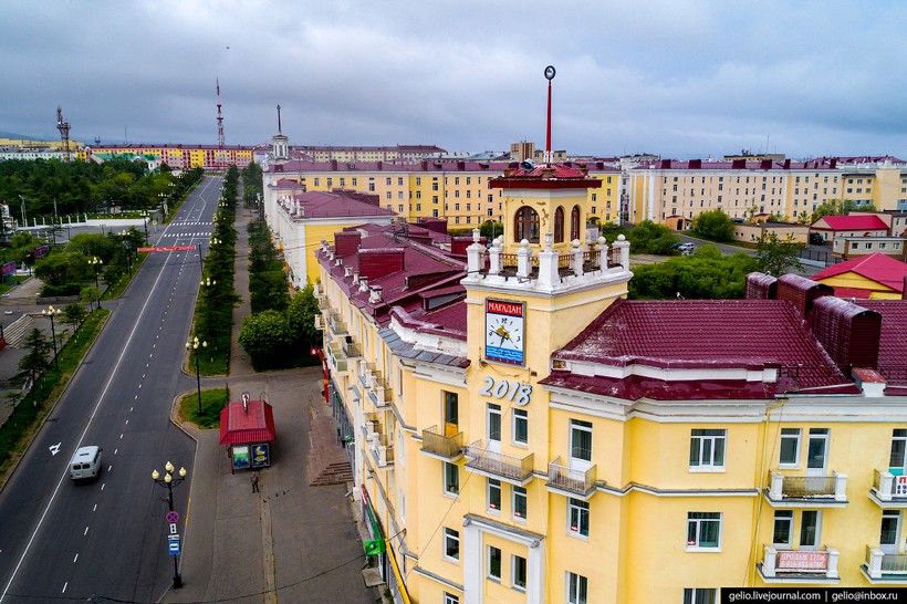 Одна из визитных карточек Магадана — дом с часами. Жилая пятиэтажка сталинской постройки в 1940-е годы была самым большим и высоким зданием на Колыме. Башенку надстроили позже — в 50-е, а часы появились в 60-е. Каждый час они играют мелодию из песни «Колымская трасса».