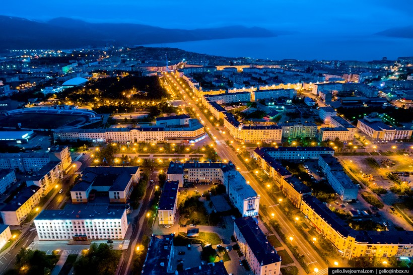 Вид на улицы Полярную, Билибина и Коммуны, названную так в честь первого в Магадане молодежного общежития — комсомольской бытовой коммуны. В начале 1933 года она была торжественно открыта в одном из двадцати двухэтажных сборно-щитовых домов, которые доставили в бухту Нагаева на пароходах в разобранном виде.