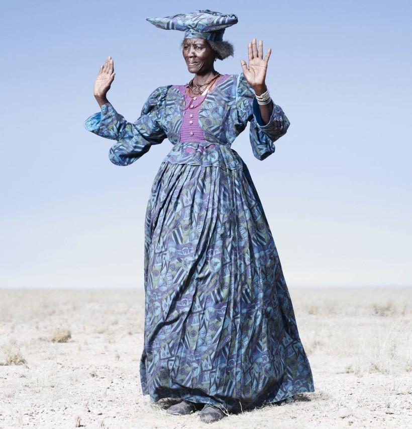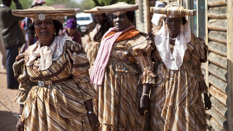 Пышные, яркие платья до земли и экстравагантные головные уборы делают женщин гереро похожими на европейских модниц конца позапрошлого века, которые заблудились на просторах африканской саванны. А между тем до прихода европейцев в юго-западную часть Африки традиционный наряд представителей этой народности был во многом похож на костюмы соседних племен и состоял из шкур животных и ручных украшений.