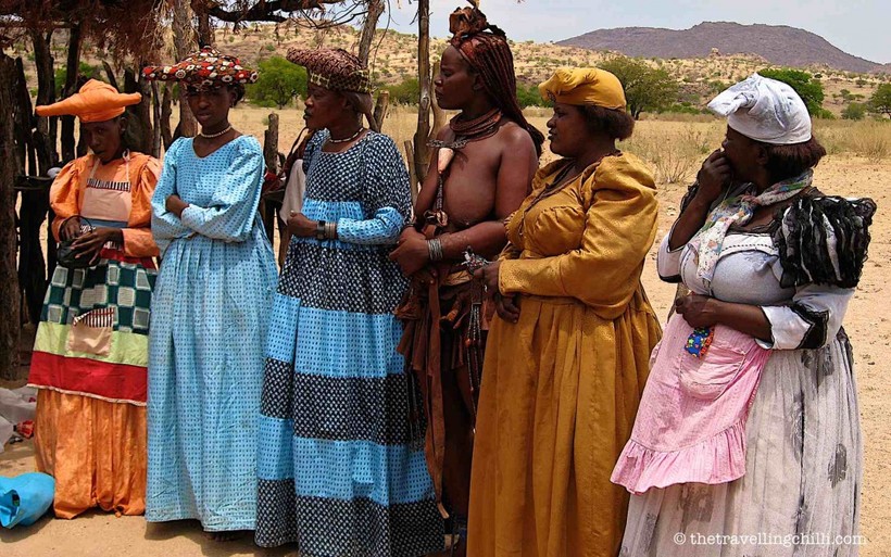 Несмотря на столь печальные последствия общения с европейской цивилизацией, новый национальный костюм удивительным образом прочно вошел в жизнь гереро. Благодаря необычным платьям, в которых женщины гереро ходят каждый день, их легко можно отличить от других народов Намибии. Интересно, что на пошив такого платья уходит до 9 метров ткани. Иногда в общинах гереро среди женщин, одетых в длинные платья, можно увидеть африканку в бусах и козьей шкуре. Это представительница родственных химба, которая вышла замуж за мужчину гереро, но при этом так и осталась верна своему традиционному костюму. Встречается и обратная ситуация. Подобная толерантность всегда поражает туристов, а вот и гереро, и химба относятся к такому проявлению племенной идентичности совершенно спокойно: если она химба, то будет ходить в козьих шкурах и браслетах, даже если вокруг нее все носят шикарные платья конца позапрошлого века.