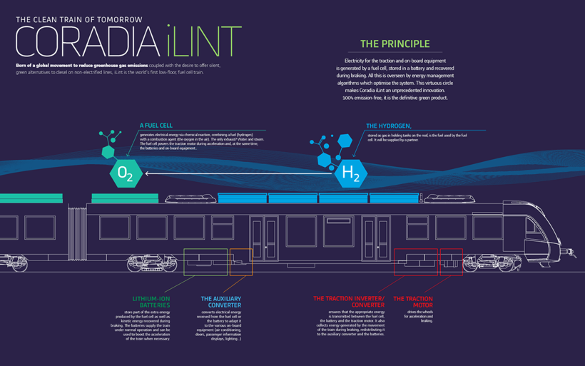 Внешне поезд, разработанный французскими инженерами компании Alstom, ничем не отличается от подобных средств передвижения. Только в качестве источника энергии в них используются не традиционные виды топлива, а энергия реакции соединения водорода и кислорода. Полученная энергия накапливается в батареях ионно-литиевого типа, которые установлены в самом поезде, и расходуется по мере движения. На одной емкости с водородом состав может проехать около 1000 километров, развивая при этом скорость до 140 км/час. При этом все бортовые системы также работают за счет водородного топлива. Сам водород для заправки поставляют промышленные предприятия, на которых этот элемент является побочным продуктом.