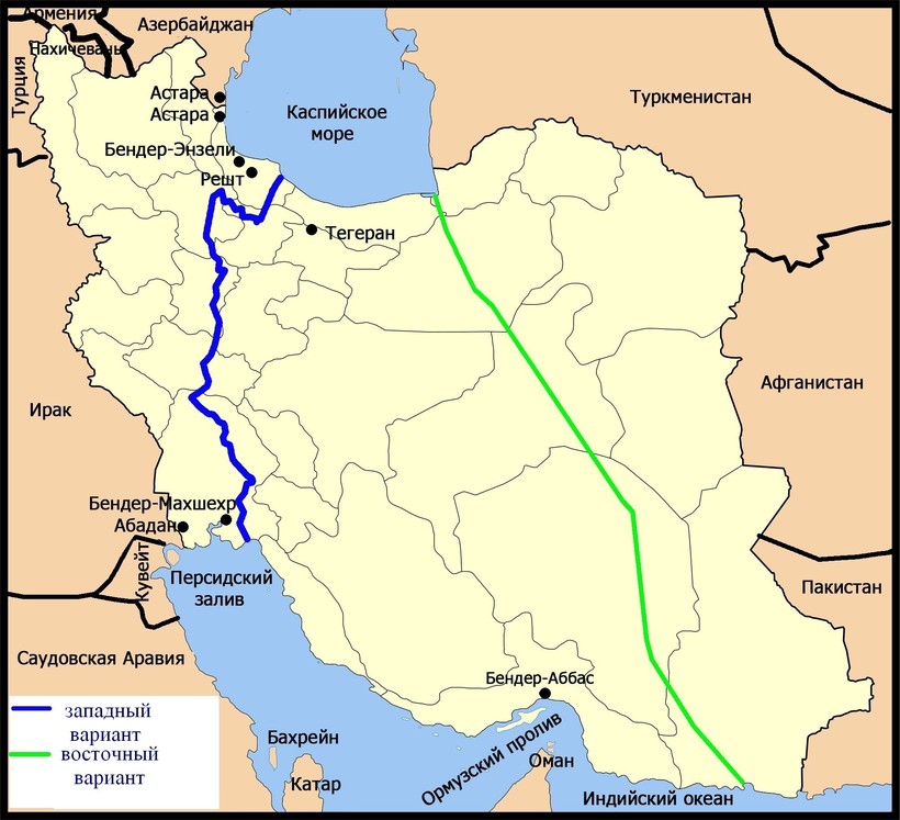 Трансиранский канал «Каспий — Персидский залив» на данный момент имеет два основных варианта строительства: с выходом в Персидский залив и с выходом в Оманский залив. Западный вариант канала предполагает выход в Персидский залив, а его протяженность составит около 650 километров. При этом придется создать ряд водохранилищ, затопить большое количество плодородных земель и переселить значительное количество людей. Второй вариант проекта — восточный — не так труден с точки зрения возможного затопления, но зато имеет протяженность почти 1000 километров. Восточный маршрут с выходом в Оманский залив будет проходить по крайне засушливой местности, что также усложняет строительство.