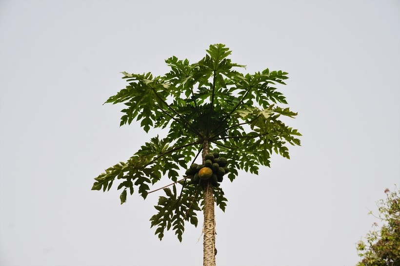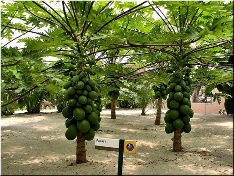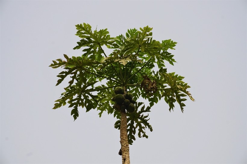 Оказалось, что папайя растет на тонких и не очень высоких деревьях, листья кроны которых лично мне напоминают канабис. Сами плоды растут гроздьями, стелясь по верхней части ствола.