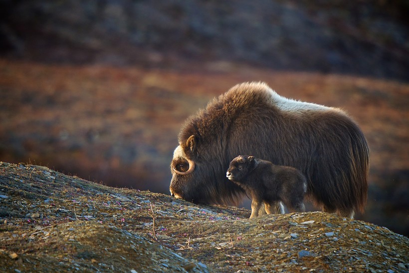 Телята появляются на свет в мае-июне, чтобы окрепнуть и подрасти до наступления суровой зимы. Только родившиеся телята овцебыков имеют значительную жировую прослойку и густой мех, ведь даже в мае в Арктике все еще бывают морозы до минус 15-20 градусов.
