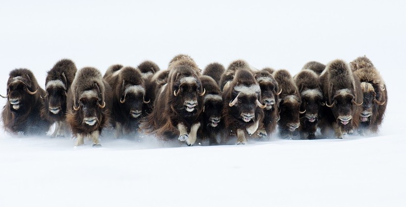 Заметив опасность, овцебыки не поддаются панике, а занимают оборонительную позицию, вставая кругом, в центре которого находятся детеныши — самое ценное, что есть в стаде. Мощные рога и суровый взгляд огромных самцов красноречиво говорят о том, что хищникам лучше поискать другой обед. А в этом видео наглядно показано, как овцебыки выстраивают оборонительное кольцо.