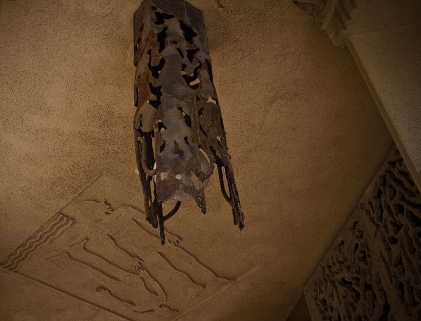 Дизайнерское решение завершают железная люстра и гравюра, на которой изображены два человека — идущий в город и к морю.