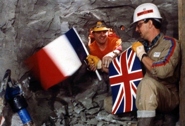 Британский и французский инженеры приветствуют друг друга во время строительства Евротоннеля, 1990 год