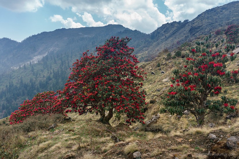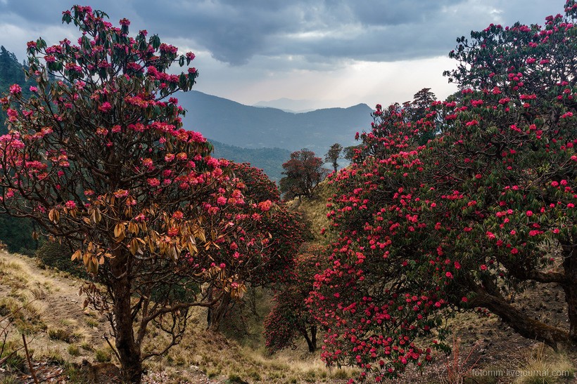 Больше всего меня поразили вот эти райские кущи — склоны гор, местами почти сплошь покрытые яркими цветами лалигурасов! Все оттенки красного, а порой даже лилового и фиолетового.
