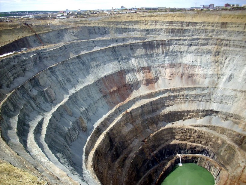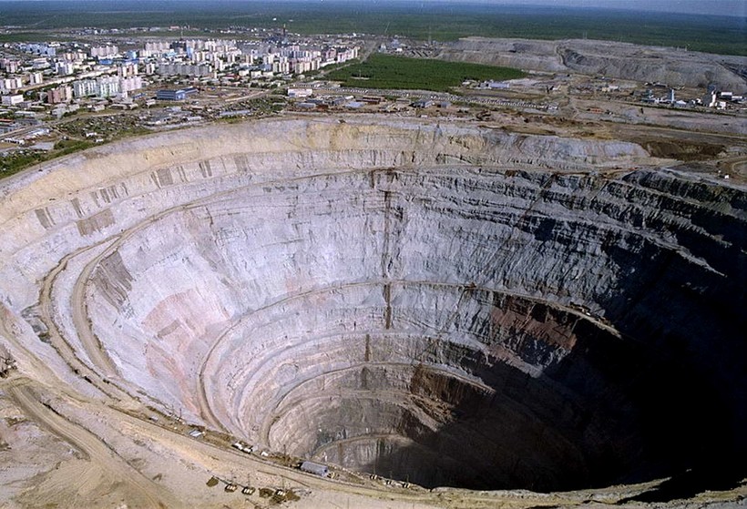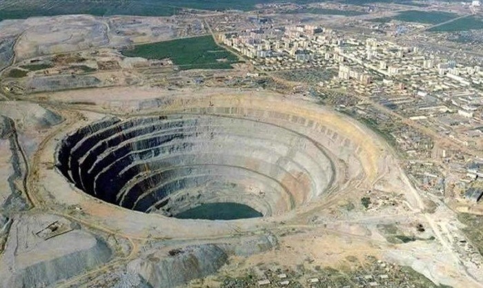 Глубина этой огромной дыры, расположенной в Якутии, достигает 525 м, а ширина — 1,2 км. Ее называют одним из самых больших карьеров в мире.