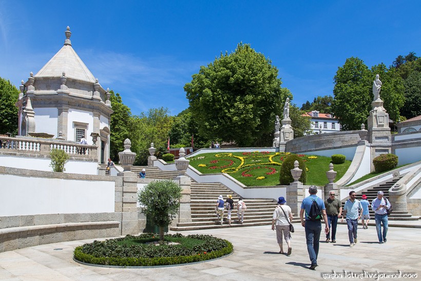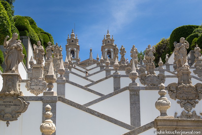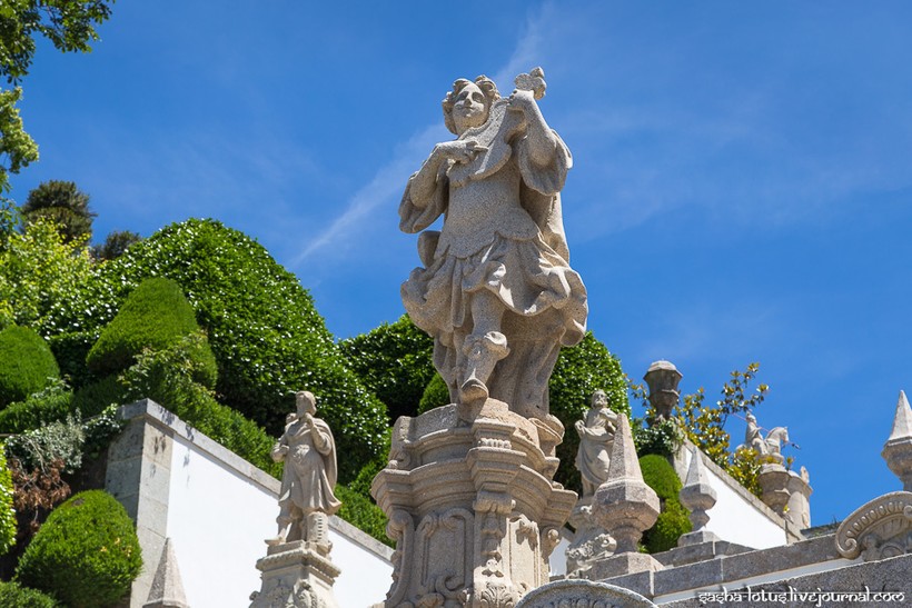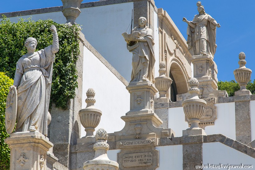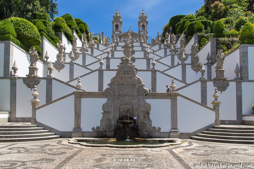 Помимо намоленности места, святилище Бон-Жезуш-ду-Монте получило мировую известность благодаря той самой зигзагообразной лестнице Via Sacra, насчитывающей 577 ступенек и разделенной на три пролета. Самая нижняя и короткая часть, лестница портика с гербом архиепископа Море-Теллиша, осталась за пределами сего репортажа, а тот самый открыточный, если можно так выразиться, и узнаваемый образ формируют лестницы Пяти Чувств и Трех Добродетелей. Лестница Пяти чувств берет свое начало от фонтана с пятью ранами Христовыми — вода вытекает в чашу из пяти отверстий в гербе Португалии.