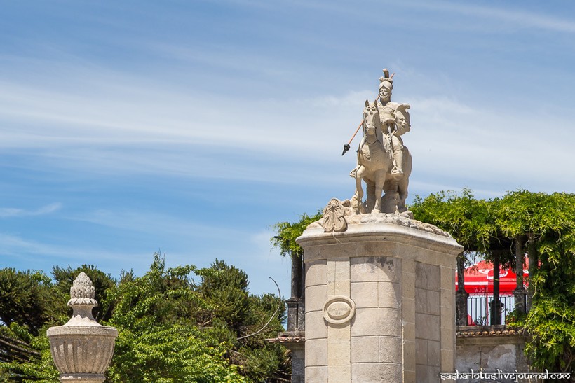 Первую просторную террасу словно охраняет доблестный воин верхом на коне, в доспехах и с острым копьем наготове. По незнанию реально предположить, что перед нами один из португальских королей, сыгравший важную роль в истории страны и покровительствовавший Браге и святилищу Бон-Жезуш-ду-Монте, в частности. А на самом деле — святой Лонгин, римский центурион, пронзивший бок распятого на кресте Иисусу копьем и впоследствии глубоко раскаявшийся в содеянном и обратившийся в христианскую веру.