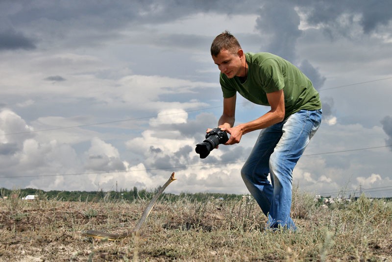 Самое главное в фотографировании диких животных — это, собственно, найти животное. Порой это бывает непросто. Змей у нас лучше всего снимать в конце апреля — начале мая, в это время у них брачный период, поэтому активность максимальная. К тому же весной трава еще низкая, обнаружить в ней змею намного проще, чем летом. Но обычно приходится попотеть при поисках. Бывало я проходил больше двадцати километров и не встречал ни одной змеи, а один раз на пяти километрах встретил сразу трех.