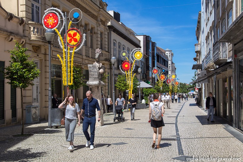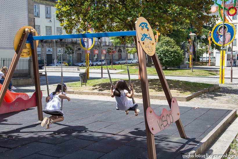 После бурлящих днем и ночью Лиссабона и Порту провинциальная уютная Брага предстала эдаким островком спокойствия, куда португальцы переезжают во второй половине жизни, чтобы беззаботно проводить старость, обращаясь к Богу. Не одному мне показалось, что в поговорке Лиссабон и Порту поменяли местами? Статус столицы и подразумевает, что там время на кутеж остается лишь в выходные да после работы, зато в Порту, где портвейн и кофе с портвейном предлагают чуть ли ни на каждом углу, и где вдоль набережной круглосуточно стоит гвалт, шум и веселье, атмосфера, понимаете, рабочую напоминает крайне отдаленно. Вынырнув из лабиринта украшенных ко Дню святого Иоанна улочек на одну из центральных площадей Браги, мы ощутили хоть какую-то движуху.
