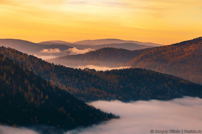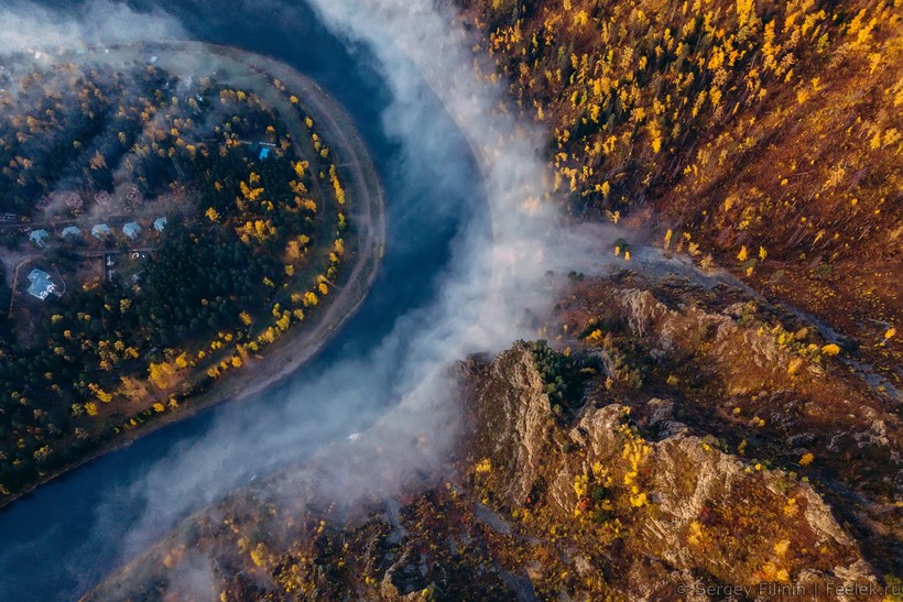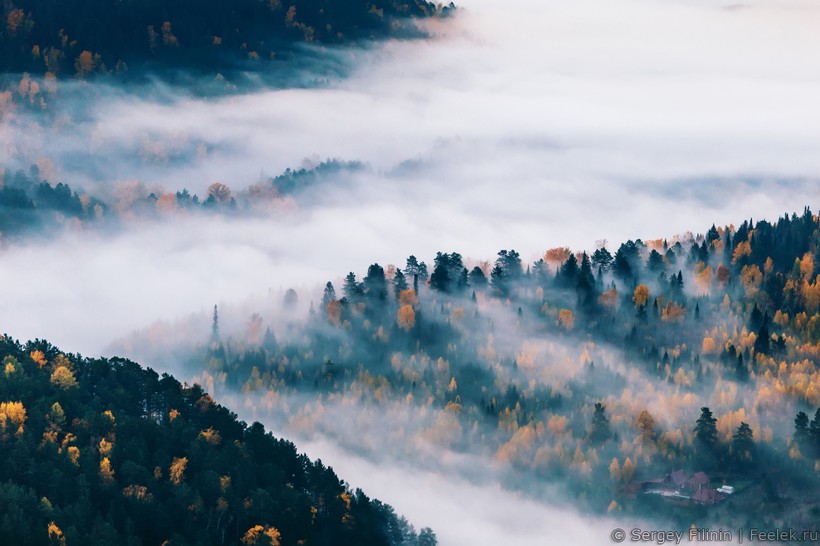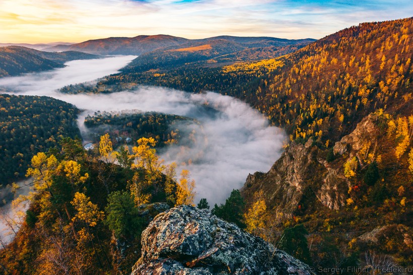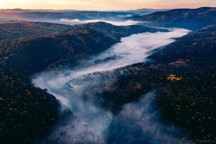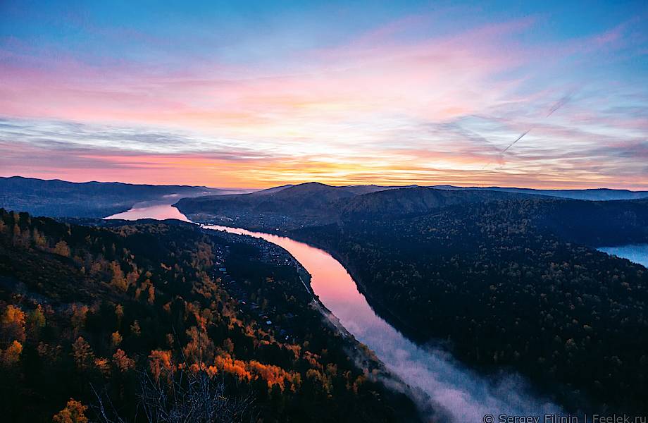 Живописный сентябрьский туманный рассвет над рекой Мана.