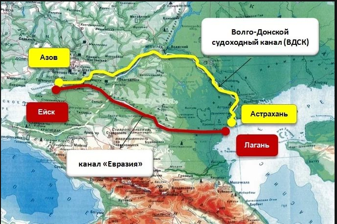 Канал «Евразия» предполагается проложить по территории Кумо-Манычской впадины. Это естественное понижение в рельефе, которое является условной границей между Европой и Азией, и где в прошлые геологические эпохи располагался пролив, соединяющий Каспийское и Черное моря . Здесь уже имеется ряд водохранилищ, каналов и шлюзов, которые были построены в 30-40-х годах прошлого столетия.