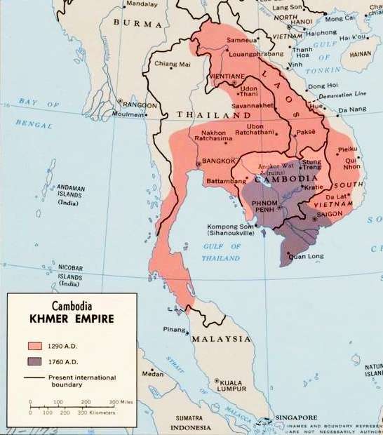 Кхмерская империя существовала на территории южной части полуострова Индокитай в IX-XV веках. Ее площадь была больше, чем территория современной Камбоджи, а столица располагалась в Ангкоре.