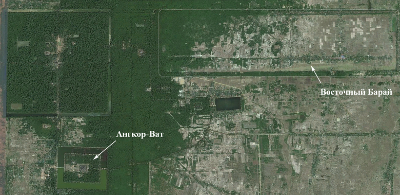 Интересно, что у Западного Барая был почти такой же грандиозный брат-близнец. Это водохранилище Восточный Барай, которое также располагалось в Ангкоре и по своим размерам лишь чуть уступало Западному Бараю. Его ширина — 1,7 км, а длина — 7,1 км. Как предполагают историки, оно было построено раньше, в IX веке. В центре этого водохранилища был расположен храм Восточный Мебон. Но на сегодняшний день оно не используется, вода спущена, и от него остались лишь валы и огромная площадка, которая хорошо видна на космоснимках. В некогда грандиозном водохранилище располагаются рисовые поля и дома местных жителей.