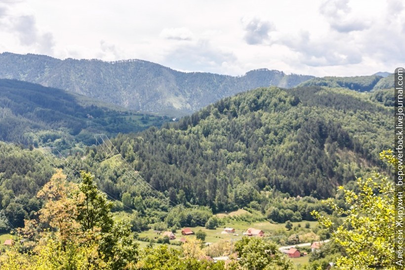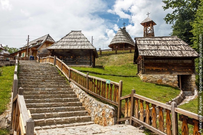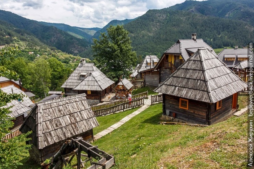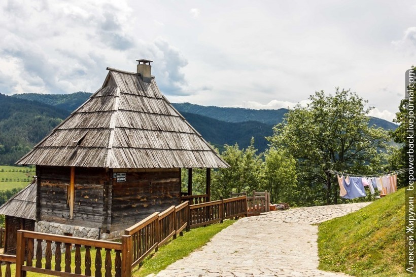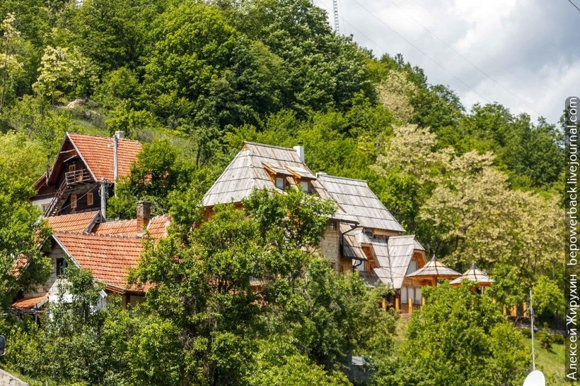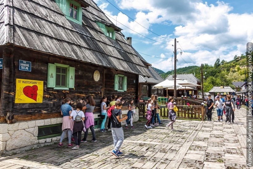 Вход в деревню платный, но и недорогой, всего 2.1 евро, но оплата только налом. Можно оплатить в евро, в боснийской или сербской валюте. Проблема была в том, что евро мы все потратили, боснийскими старались расплатиться до границы, ибо думали, что они уже не пригодятся, а сербские еще не наменяли. Карты тут не принимали, обменника не было, а ближайший банкомат километрах в 15, вот такое развитие туризма. Полазив по карманам, наскребли денег только на два билета, остальным пришлось ждать за деревянным забором.