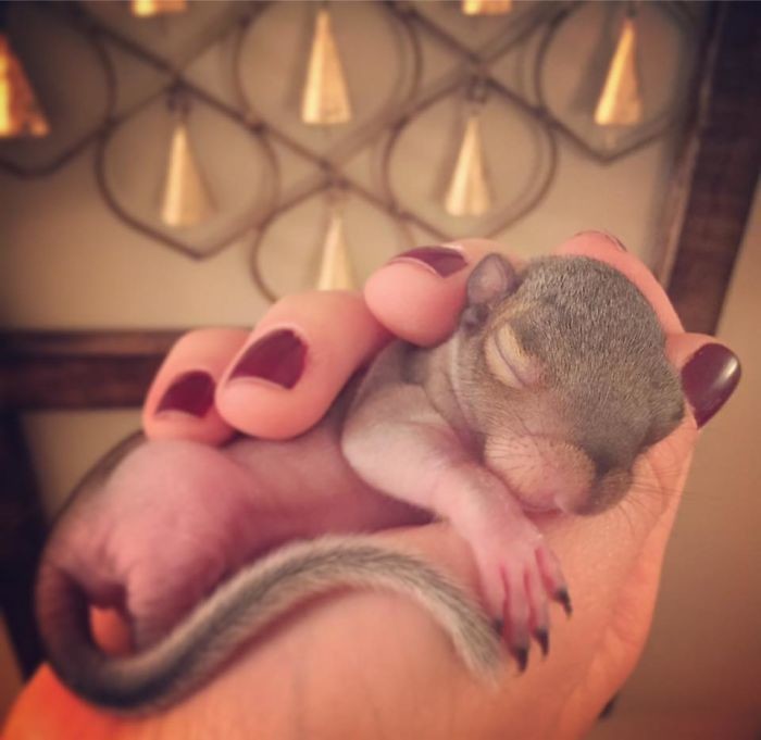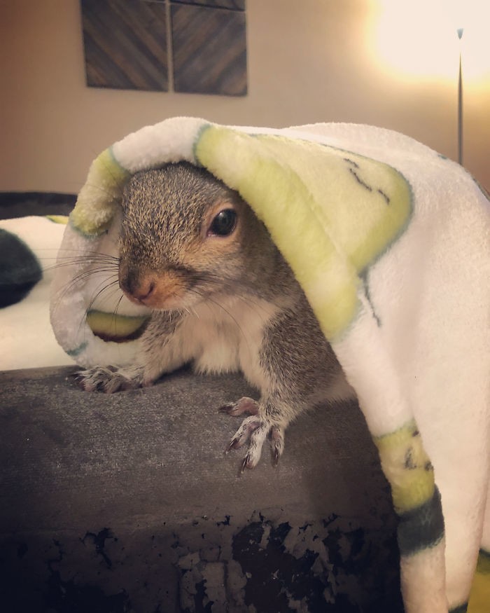 К сожалению, один из детенышей погиб, а ветеринары констатировали, что оставшийся не сможет выжить сам по себе. Тогда сотрудники организации Кристина и Майкл, помогавшие парню в самом начале, решили забрать бельчонка к себе.