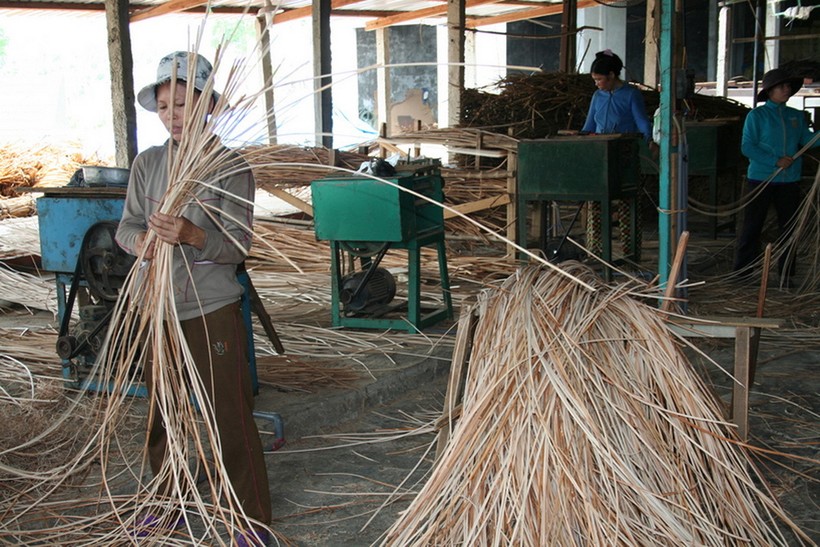 Высушенный ротанговый стебель имеет почти белый цвет. Материал, который идет на изготовление мебели, окрашивают в более темные натуральные цвета. В качестве каркаса используют цельные стебли лианы, а для ротангового полотна применяют волокна, которые получаются после расщепления стебля.