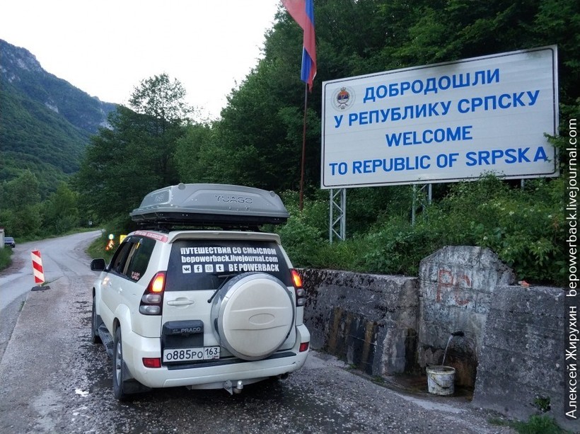 Плакат на въезде гласил, что мы въехали в Сербскую республику. Куда??? Мы ж в Боснии должны были оказаться!? Долго рассматривали штамп в паспортах с буквами БиГ и карту, ну да, все верно, а плакат этот к чему? Позже прочитали, что Сербская республика была самопровозглашенным государством и вошла в Боснию в 1995 году, хотя автономное положение она сохранила.