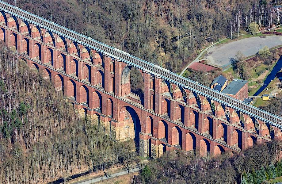Этот кирпичный виадук высотой 78 метров состоит из 4-х этажей и был введен в эксплуатацию в 1851 году. Он пересекает долину реки Гёльч и имеет протяженность 574 метра. Несмотря на чисто практичную функцию, виадук Гёльчтальбрюкке не лишен архитектурного изящества и очень гармонично вписывается в окружающий ландшафт. За свою уникальность это сооружение было внесено в список исторических памятников Германии, представляющих особую ценность с точки зрения инженерии и архитектуры.