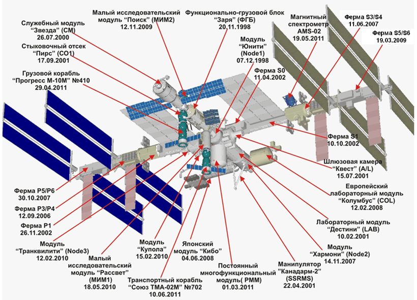 Станция составлена по принципу отдельных модулей, которых на данный момент насчитывается 15. Ее вес составляет около 460 тонн, а ее площадь сопоставима с площадью футбольного поля.